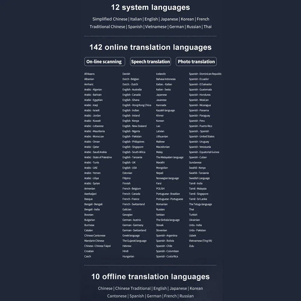 Multilingual Translation Capabilities: Equipped with 142 online scanning / online voice translation / online Photo translation options, the Translation Pen Scanner meets the diverse language translation needs. It also supports pinyin scanning for accurate translations in different languages. Additionally, it offers 10 offline scanning functions, allowing text translation without requiring an internet connection.